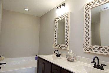 The master suite has a tray ceiling and a large master bath with a stand alone shower and garden tub.